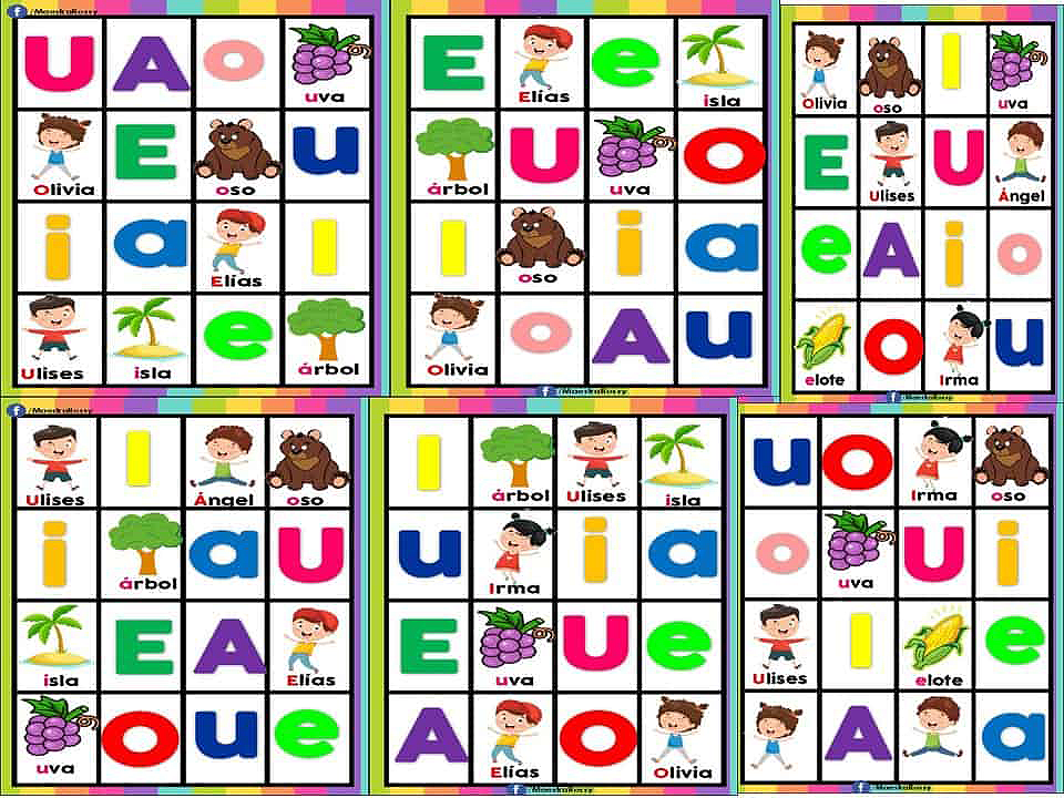 Este tipo de material consiste en tableros individuales y cartas con imágenes o letras que representan las vocales a, e, i, o, u. El docente o facilitador va nombrando las cartas, mientras el alumnado busca la vocal correspondiente en su tablero. Esta dinámica sencilla promueve la atención, la memoria visual y auditiva, así como la participación activa, ya que cada estudiante se involucra de manera directa en el desarrollo del juego.